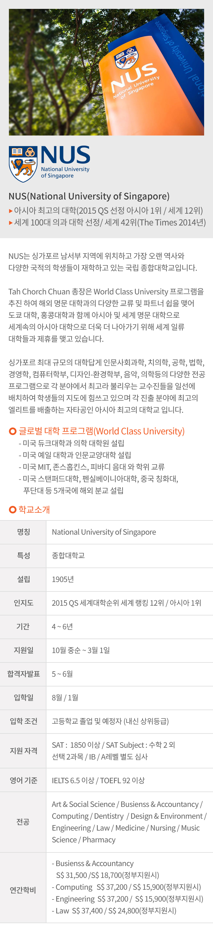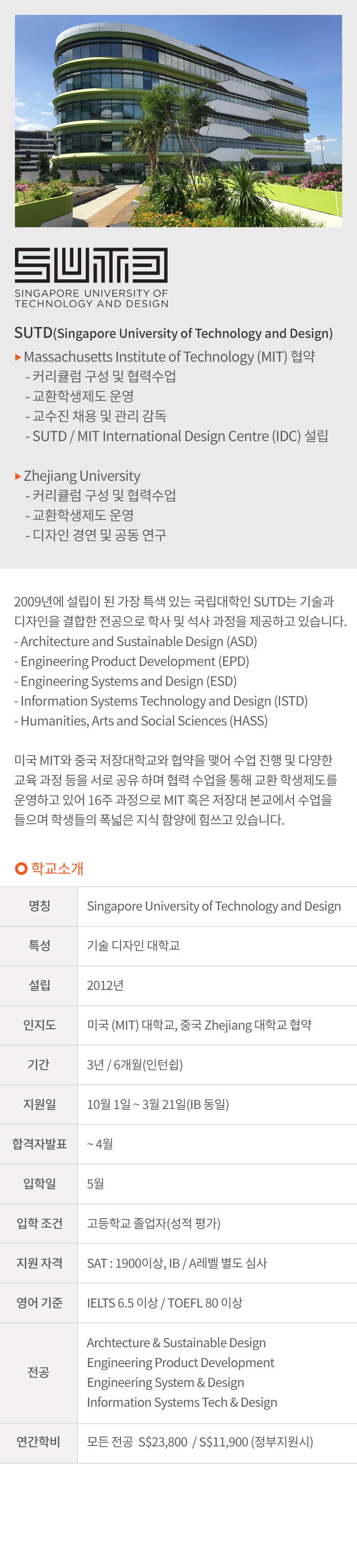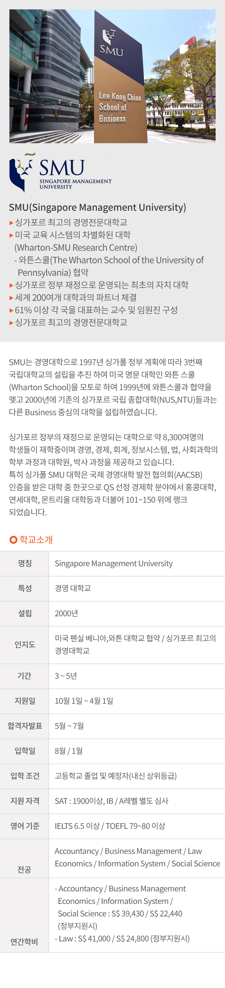 ※ 입학조건 : 싱가포르 A레벨 / SAT, AP / IB Diploma